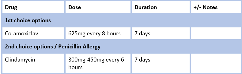 Keep a regular check on the wound to see if it is healing properly or there is any seepage or leaking of fluid from the area. An acceptable regimen includes clindamycin with an aminoglycoside or aztreonam. The GP irrigated the wound using sterile saline and removed excess saline using a sterile gauze pad.